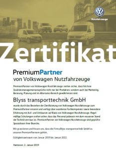 Wir freuen uns, Sie darüber informieren zu können, dass am 2. Januar 2019 das Unternehmen BLYSS transporttechnik GmbH zum PremiumPartner von Volkswagen Nutzfahrzeuge ernannt wurde.