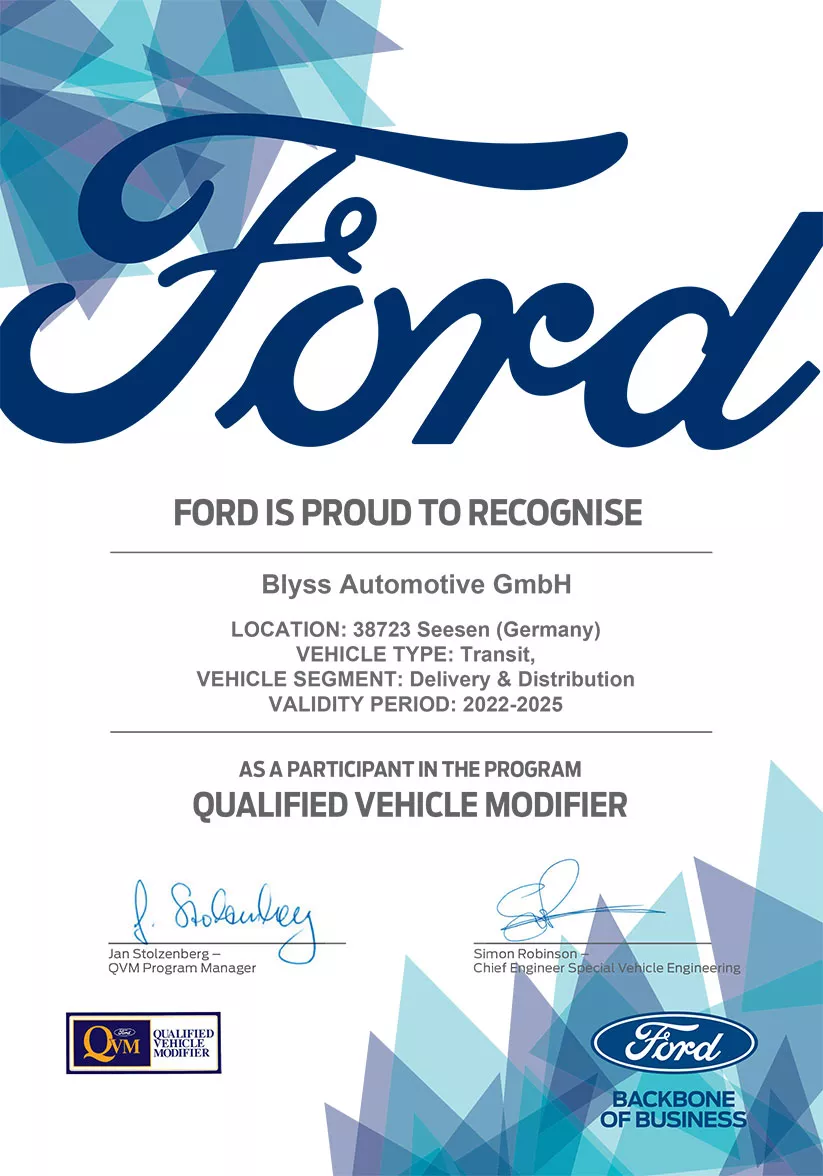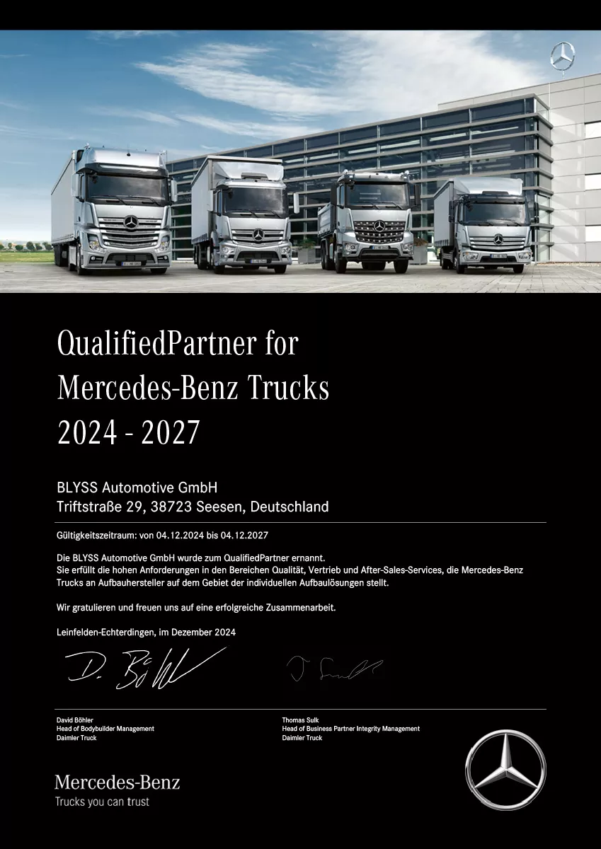 Die hohe Qualität unserer Aufbauten und die gute Zusammenarbeit mit den führenden LKW- und Transporterherstellern zeigt sich in den folgenden Zetrtifizierungen der BLYSS Automotive:
