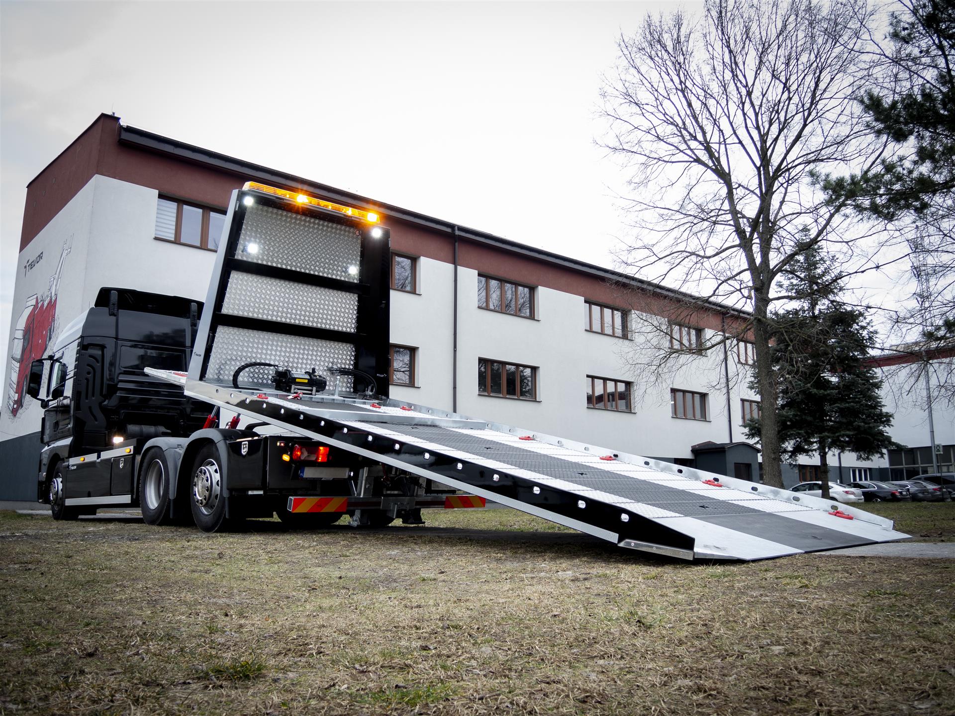 Plattformkonstruktion beugt vor Durchdringen der Flüssigkeiten aus transportierten beschädigten Autos zum Boden vor.