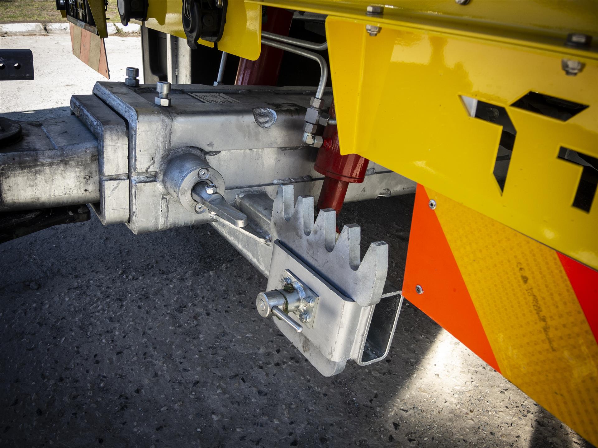 Kippbares Plateau, das mittels hydraulischen Zylindern aufgehoben und bis zu der Straße ausgefahren werden kann.